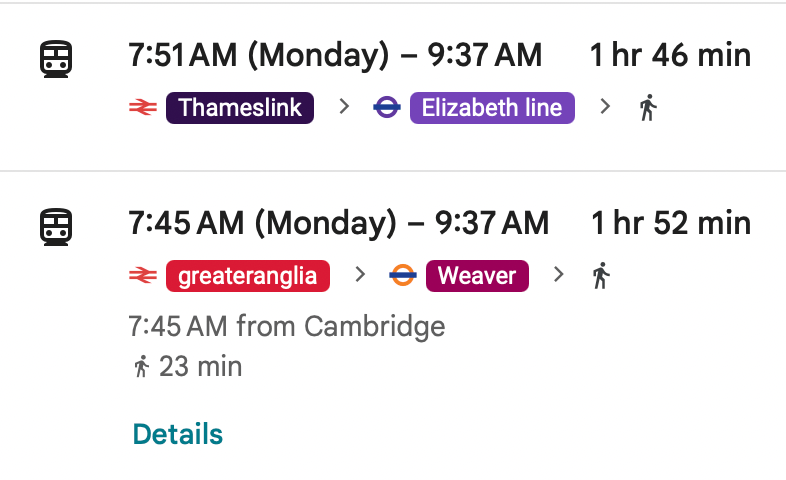 On the day of the event there are two short train routes involving a single tube stop which arrive before the start time of 10am. A third potential route is the Cambridge to London King’s Cross Great Northern Service followed by two tubes trips: Thameslink to Farringdon, then Elizabeth Line to Whitechapel (plus a short walk to QMUL). However, this route is slightly longer.